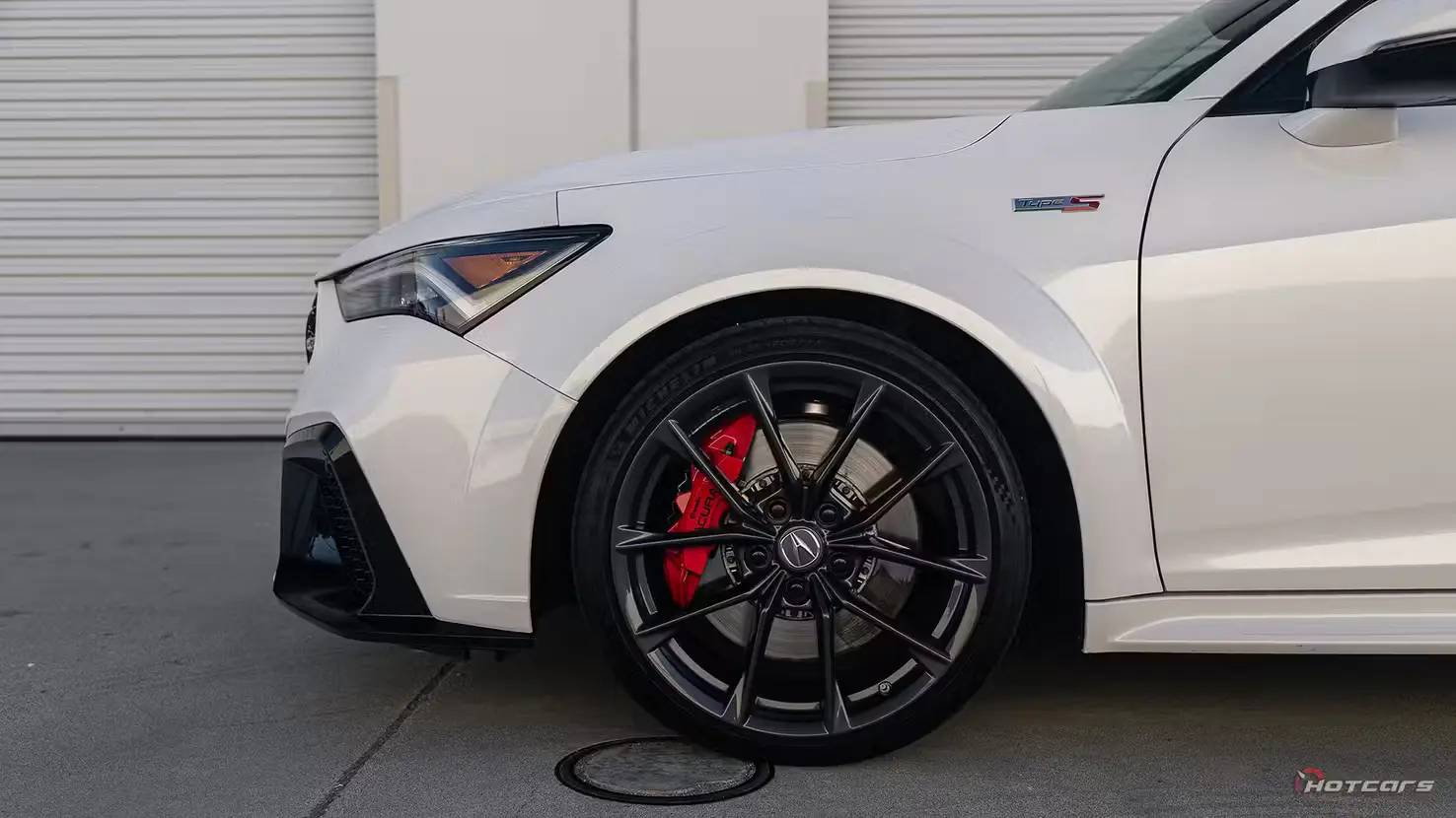 Хотя эти внешние детали увеличивают общую ширину автомобиля всего на 2,8 дюйма, это позволило инженерам Acura увеличить ширину колеи на 3,5 дюйма спереди и 1,9 дюйма сзади. Эти 19-дюймовые колеса соответственно массивные, с квадратной формой, шириной 9,5 дюйма во всех четырех углах. Я доверюсь расчетам Acura, когда они скажут, что эти колеса значительно больше, чем 18-дюймовые, которые поставляются в стандартной комплектации Integra A, но при этом на два фунта легче на колесо. Они покрыты соответственно агрессивной резиной, в стандартную комплектацию входят шины 265/30 R19 Michelin Pilot Sport 4S. В стандартную комплектацию также входят четырехпоршневые передние тормоза.