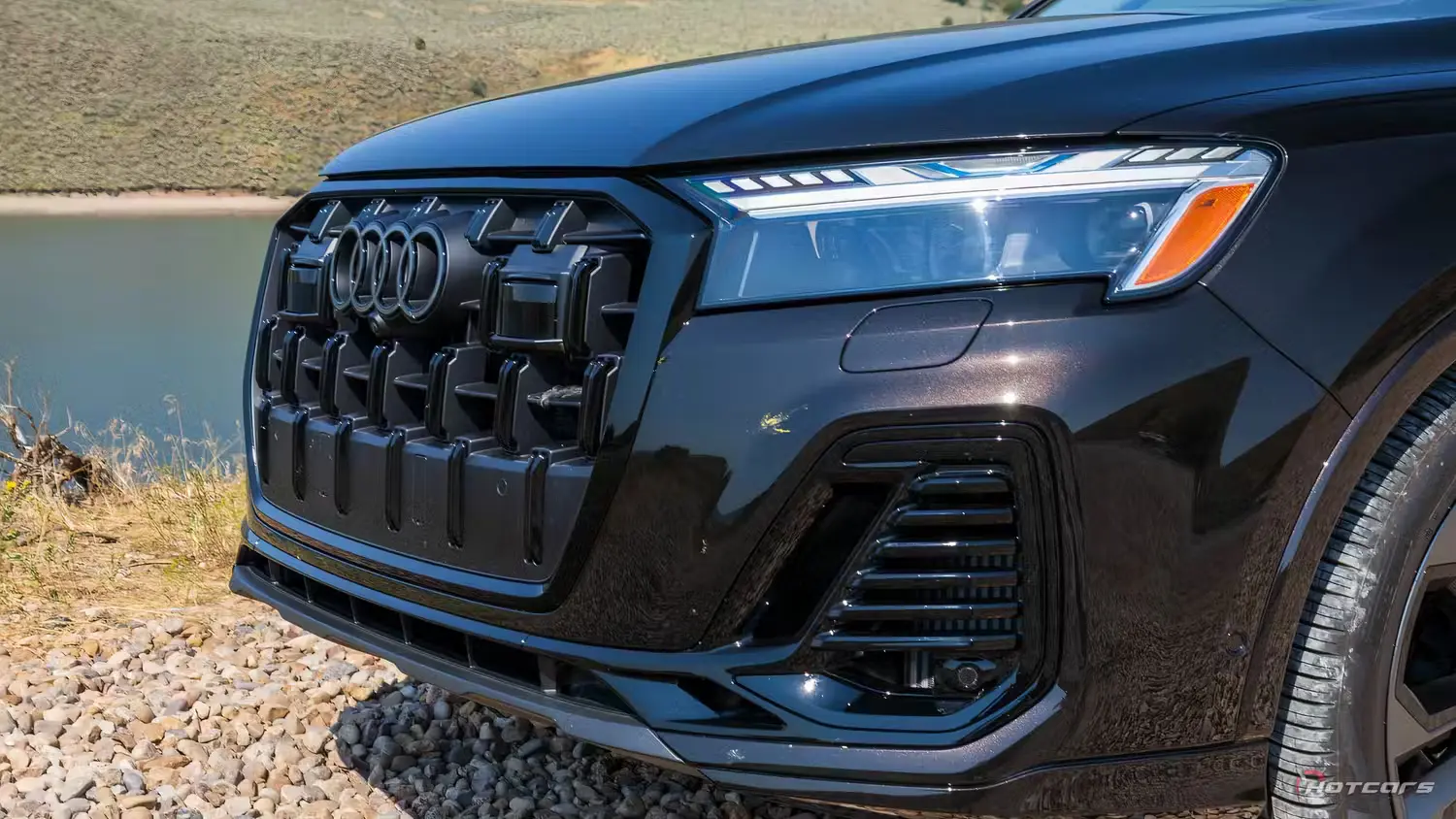Меньшее количество украшений на передней части Audi Q7 2025 года придает ей более изящный вид. Вертикальные вставки в однорамной решетке радиатора Audi делают ее выше, но в основном изменения касаются новых фар. И что это за фары, потому что США наконец-то начали догонять остальной мир в том, что касается освещения в ночное время.