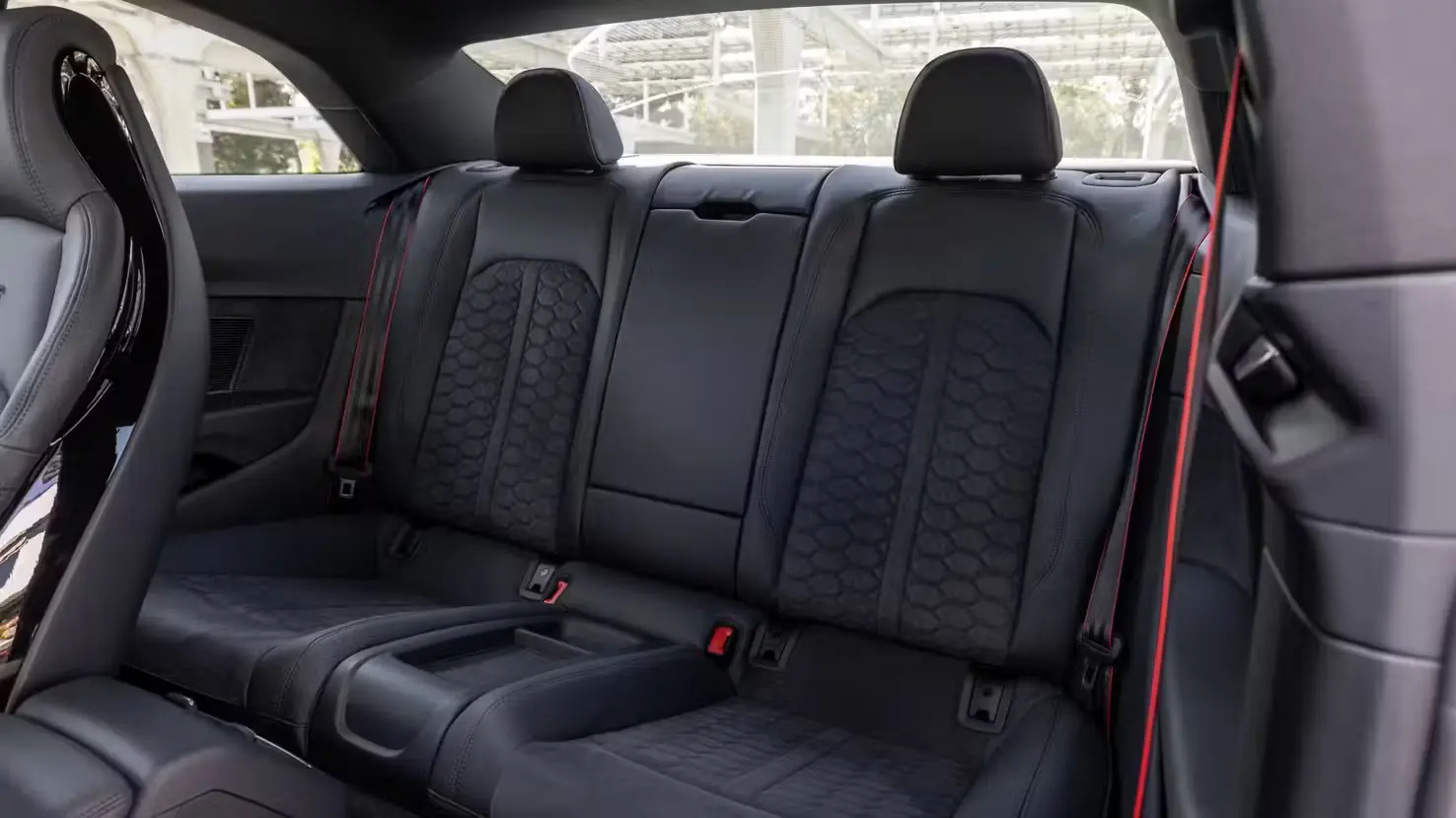 В комплектацию Competition входят вставки из углеродного матового материала, красная строчка с отклонениями и рулевое колесо из алькантары. Это также можно приобрести отдельно, если отметить в графе Дизайн-пакет стоимостью 1500 рупий. Задние сиденья удобны для двух взрослых, и если вам нужно немного больше места для ног и головы, а также более легкий доступ к задней части, то стоит обратить внимание на Audi RS5 Sportback.
