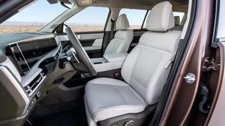Два 12,3-дюймовых экрана слегка наклонены в сторону водителя, создавая ощущение кокпита. Водительское положение выше, чем у большинства внедорожников, что еще больше усиливает ощущение командования Santa Fe 2024. Несмотря на доминирующий дизайн интерьера, в салоне Hyundai использовалось множество экологически чистых материалов. Такие поверхности, как сиденья и обивка потолка, изготовлены из переработанных материалов, так же как приборная панель и дверные карты.