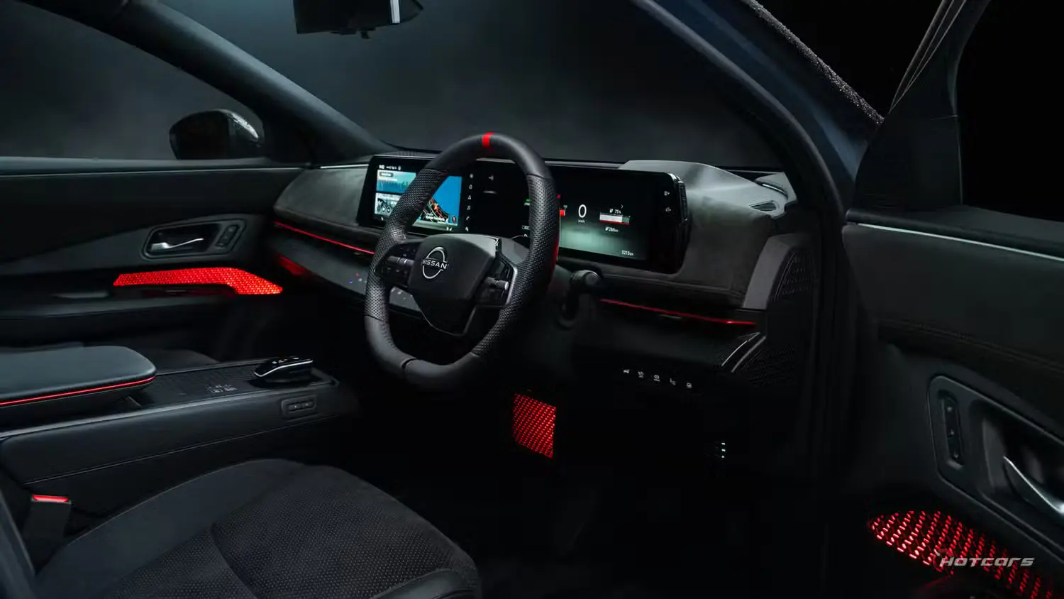 Внутри Ariya вы заметите чёткую тему, связанную с японским дизайном. Здесь нет ощущения беспорядка, и вы чувствуете себя спокойно, сидя в открытой и просторной Ariya. Парадные двери и первый этаж освещаются «андонным» освещением, вдохновлённым традиционными бумажными фонарями с японскими мотивами кумико, которые развешивают вдоль дорожек. Здесь, в Nismo, андонное освещение горит красным, а не белым, как в моделях без Nismo.