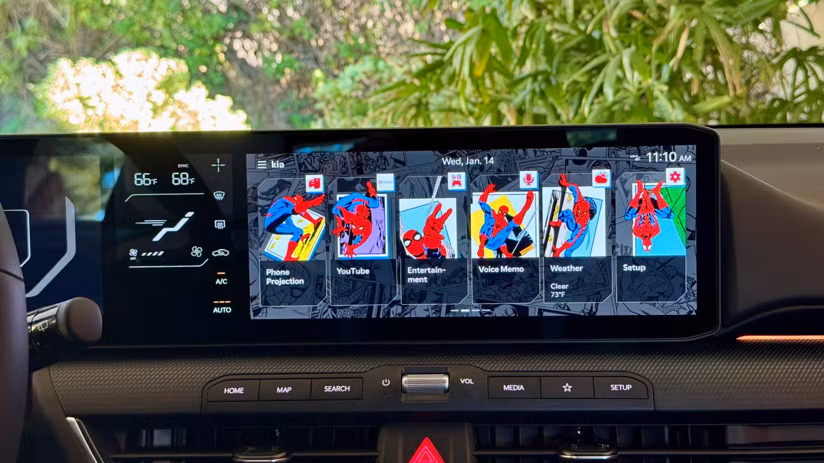 Несмотря на то, что Kia K4 — доступная модель, в ней реализовано большинство интересных и функциональных технологий. Все комплектации оснащены 12,3-дюймовым сенсорным экраном в сочетании с 5-дюймовой приборной панелью. В комплектации GT-Line Premium Package установлена более привлекательная 12,3-дюймовая цифровая приборная панель. Информационно-развлекательная система Kia имеет интуитивно понятное меню, в котором легко ориентироваться. По-сравнению, в комплектациях более высокого уровня теперь доступны загружаемые темы оформления, которые меняют цвет и детализацию экрана. Пользователи могут загружать темы от Disney (включая Pixar и Marvel), National Geographic, NBA и других. На нашем K4 была установлена тема «Человек-паук», которая не только изменила оформление меню в стиле комиксов, но и заменила значок навигации на символ Человека-паука, а цвета индикаторов — на красный, белый и синий. В теме «Звёздные войны: ситхи» тахометр и спидометр были заполнены красными световыми мечами.